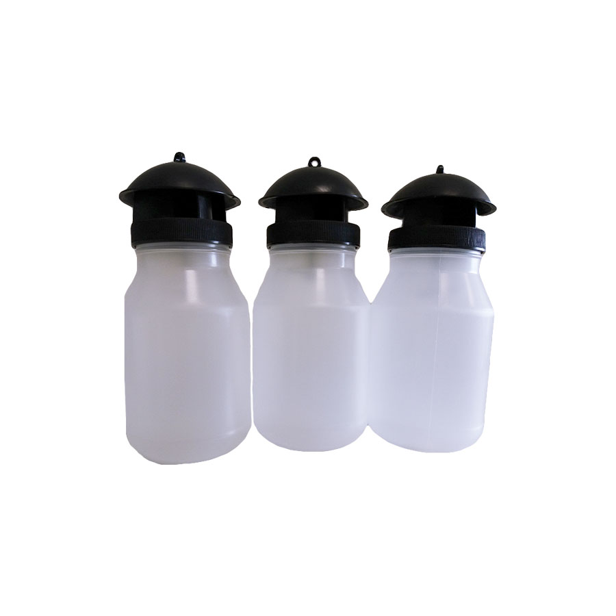 Trampa de plástico acondicionada con una cubierta que impide que el agua de lluvia ingrese al interior. La tapa tiene 4 orificios de 10 mm por donde ingresan las moscas.